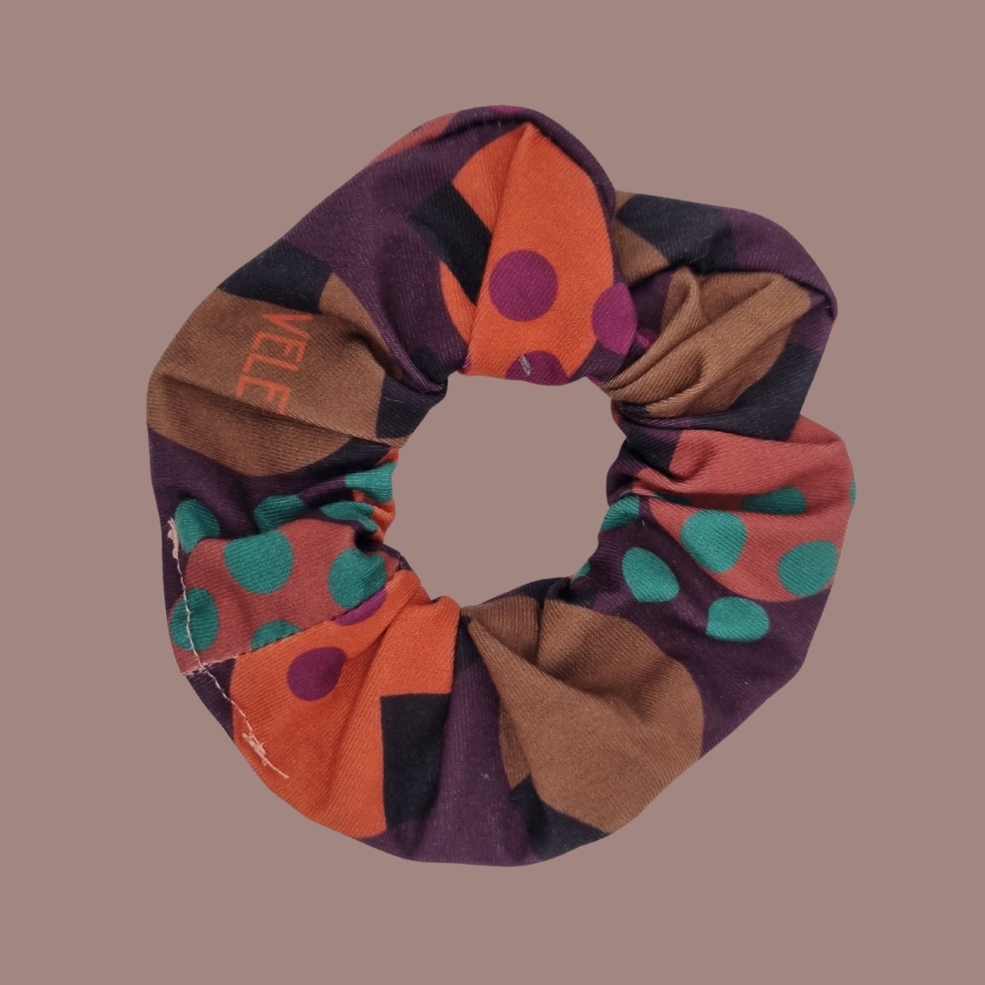 Scrunchie de tela suave con estampado geométrico sobre fondo berenjena. Diseño exclusivo de Veletta.